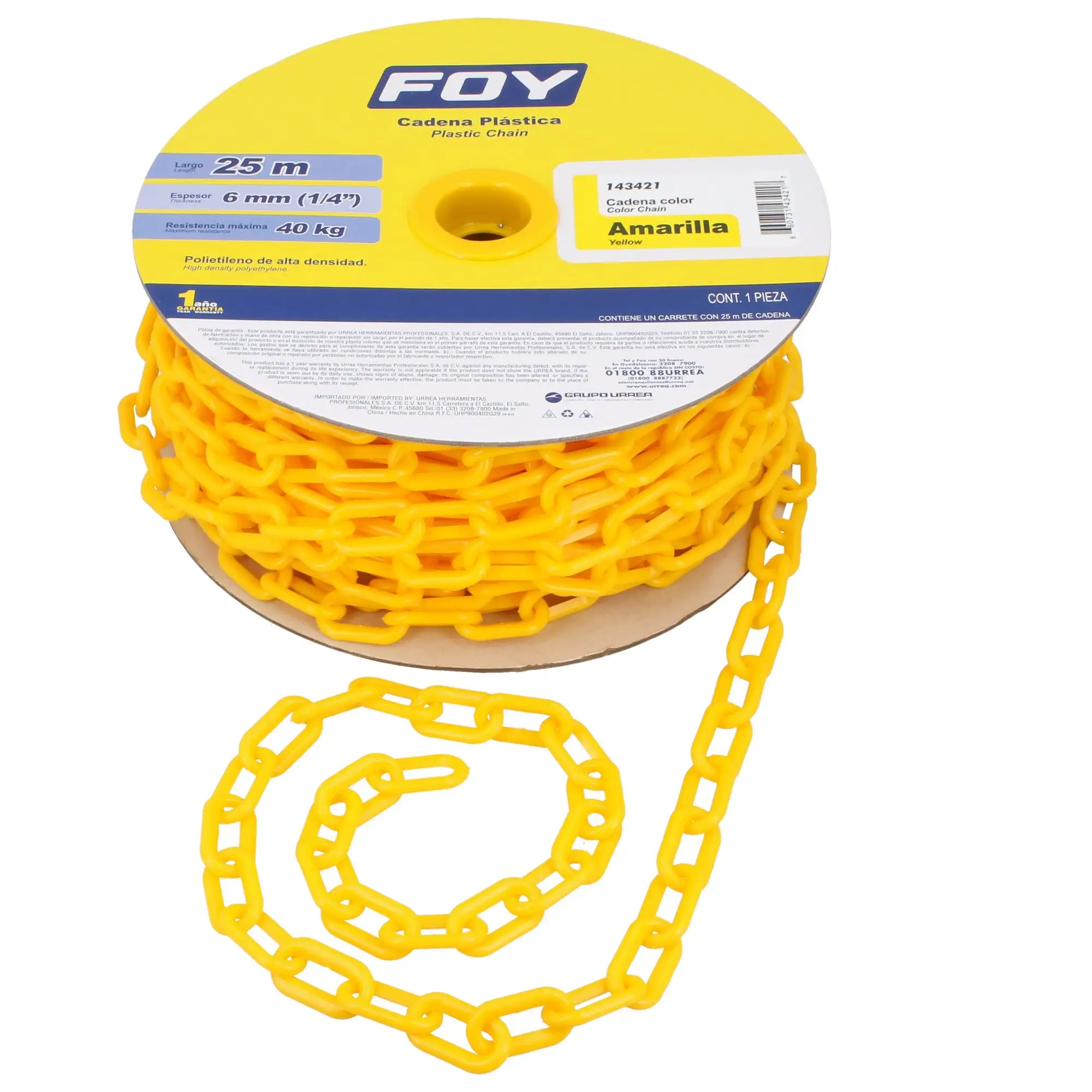 ROLLO DE CADENA PLASTICA DE 6MM X 1/4″ DE 25MT COLOR:AMARILLA MODELO:143421 SURTEK – 143421